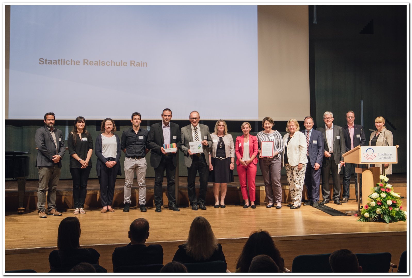 In der Bildmitte mit Siegelplakette Realschuldirektor Gerhard Härpfer und links daneben Konrektor Christian Sattich in Mitten der Delegation aus Rain (v.l.n.r. Christine Brönner, Susanne Schleger, Jürgen Herrmann, Petra Forthofer, Manuela Wiedemann und Claudia Marb), daneben Laudatoren und Verantwortliche von SCHULEWIRTSCHAFT Bayern sowie der Ministerialbeauftragte für die Realschulen in Schwaben, Bernhard Buchhorn (vierter von rechts).