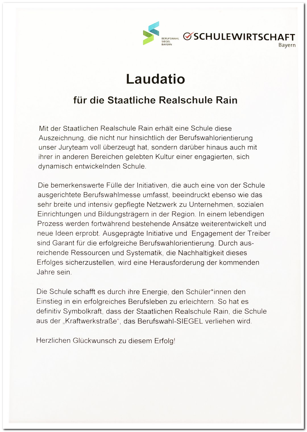 Staatliche Realschule Rain erhält Berufswahl-SIEGEL