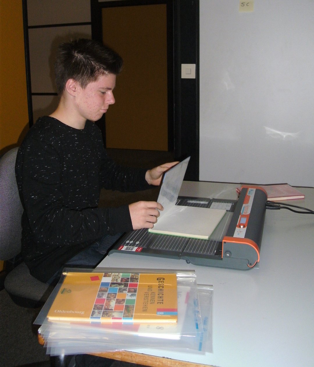 In diesem Jahr wurde eine Bucheinbindemaschine gekauft. Es besteht für alle Schülerinnen und Schüler die Möglichkeit, ihre Bücher gegen einen Unkostenbeitrag von 1 Euro pro Buch damit einbinden zu lassen.