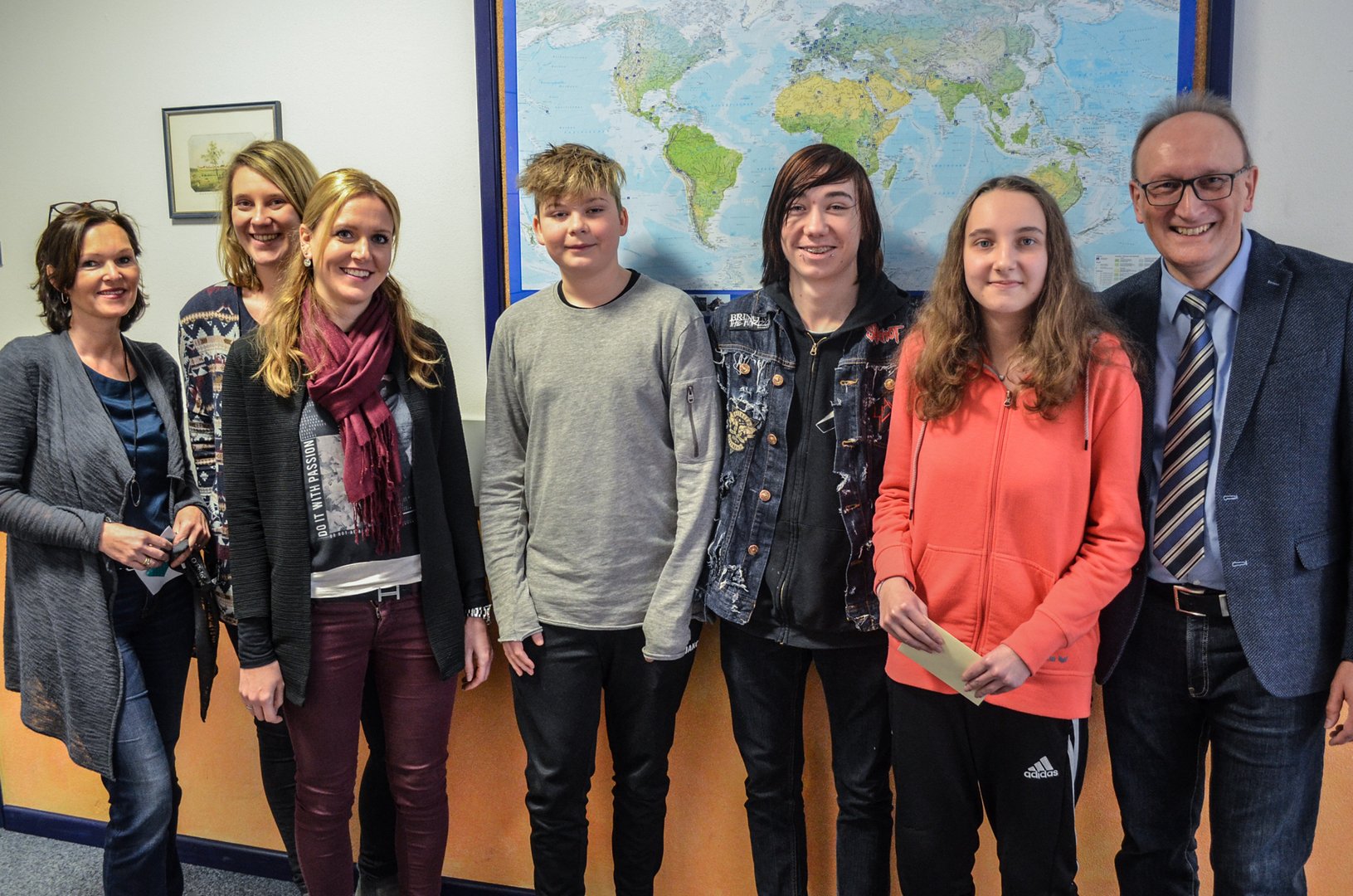 Bei der Siegerehrung gratulierten Schulleiter Gerhard Härpfer und die betreuenden Geographielehrerinnen (von links) Brigitte Angermayr, Katharina Daferner und Melanie Eubel den erfolgreichen Teilnehmern Jakob Lohner, Christian Göbel und Alina Wünsch zu ihren hervorragenden Leistungen.