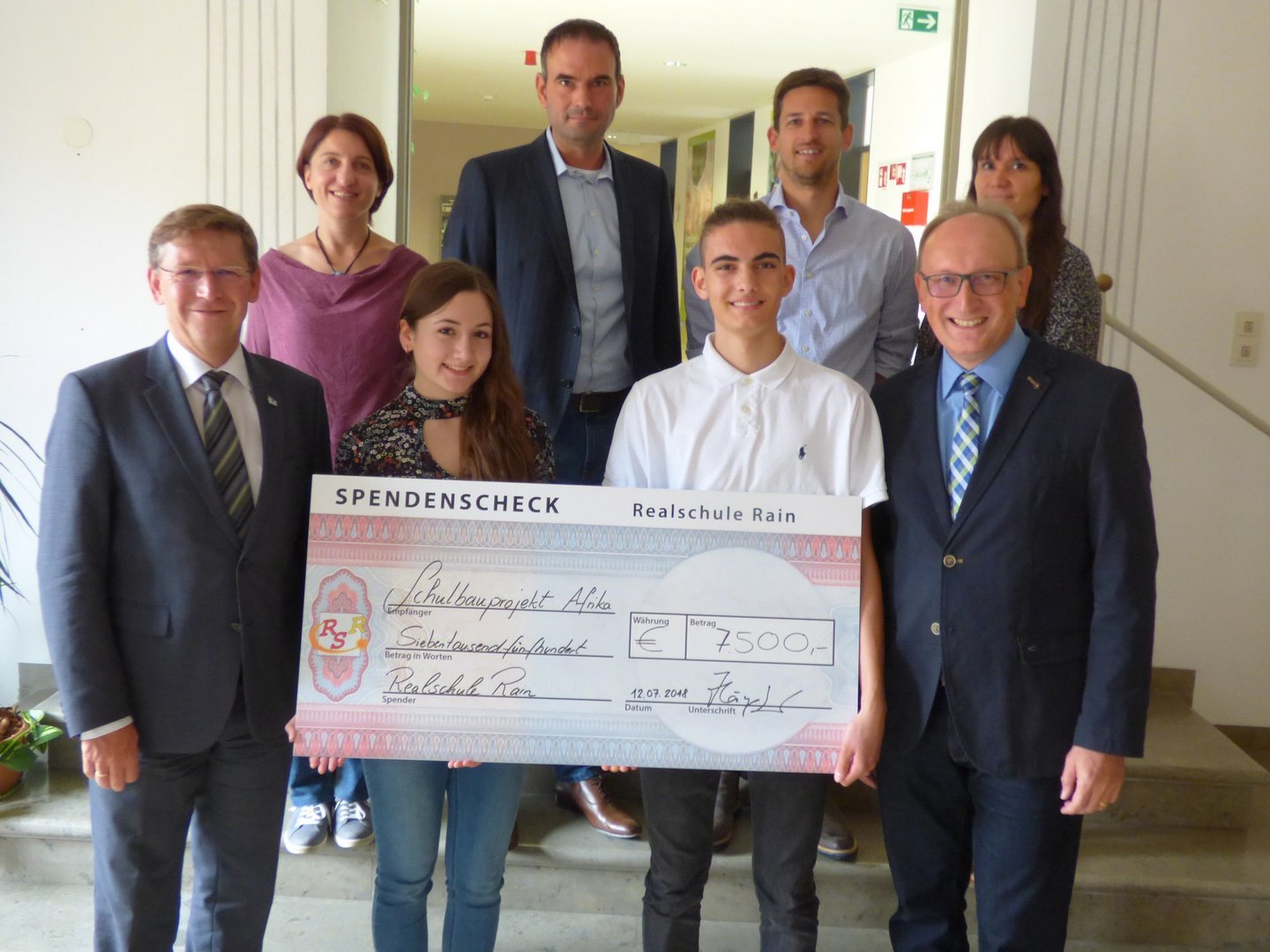 Nach dem Eingang der Spenden übergaben nun Schulleiter Gerhard Härpfer, Konrektor Christian Sattich, die an der Organisation beteiligten Lehrkräfte Christine Brönner, Christine Förg und Jürgen Herrmann gemeinsam mit den Schülersprechern Angelina Weis und Tim Sattich einen Spendenscheck in Höhe von 7.500 € an Landrat Stefan Rößle. Dieser zeigte sich vom Engagement und der Spendensumme überwältigt: „Meinen größten Respekt vor der Organisation dieser vorbildlichen Aktion. An einem einzigen Tag konnten die Schülerinnen und Schüler mit der großzügigen Unterstützung Ihrer Familien und Freunde damit einen großen Teil zu unseren Schulbauprojekten in Burkina Faso beitragen. Vielen Dank für Ihr Engagement.“