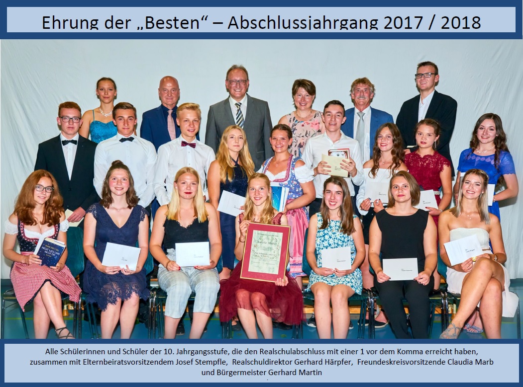 Anschließend überreichte Schulleiter Gerhard Härpfer mit den jeweiligen Klassenleitern die Abschlusszeugnisse. Die Schüler betraten dazu nacheinander die Bühne, während Bilder von ihnen auf einer Leinwand gezeigt wurden. Im Anschluss daran ehrte Bürgermeister Gerhard Martin als Vertreter der Stadt Rain und Claudia Marb als Vertreterin des Landkreises die diesjährige Jahrgangsbeste für ihre hervorragende Leistung: Mit einem Notenschnitt von 1,00 konnte Amelie Huber ein perfektes Ergebnis abliefern, was mit einem langanhaltenden Applaus durch alle Anwesenden gewürdigt wurde. Vom Elternbeirat wurden dann die Klassenbesten ausgezeichnet: Niklas Bauer und Selina Neubauer (10 A), Daniel-Antonio Bolea-Lazar (10 B), Julia Braun (10 C), Lisa Edel (10 D), Angelina Weis und Lea Wittmeier (10 E) und Lea Fürst (10 F) erhielten Buchgeschenke aus den Händen vom Vorsitzenden Josef Stempfle. Weitere Preise gab es durch die Stadt Rain für Sebastian Hummel, Monika Gadomski, Leonie Roßkopf, Selina Ernstberger, Daniel Gail, Valentin Gastl, Laura Wagner, Theresa Tschirner und Natalia Chojnowska, deren Notendurchschnitt jeweils eine Eins vor dem Komma hatte. Eine Tradition an der Rainer Realschule ist, dass jeder 100. Absolvent ein Goldstück als Erinnerung erhält. Als 4200. und 4300. Abschlussschüler freuten sich Niklas Bauer und Laura Förg über dieses besondere Andenken.