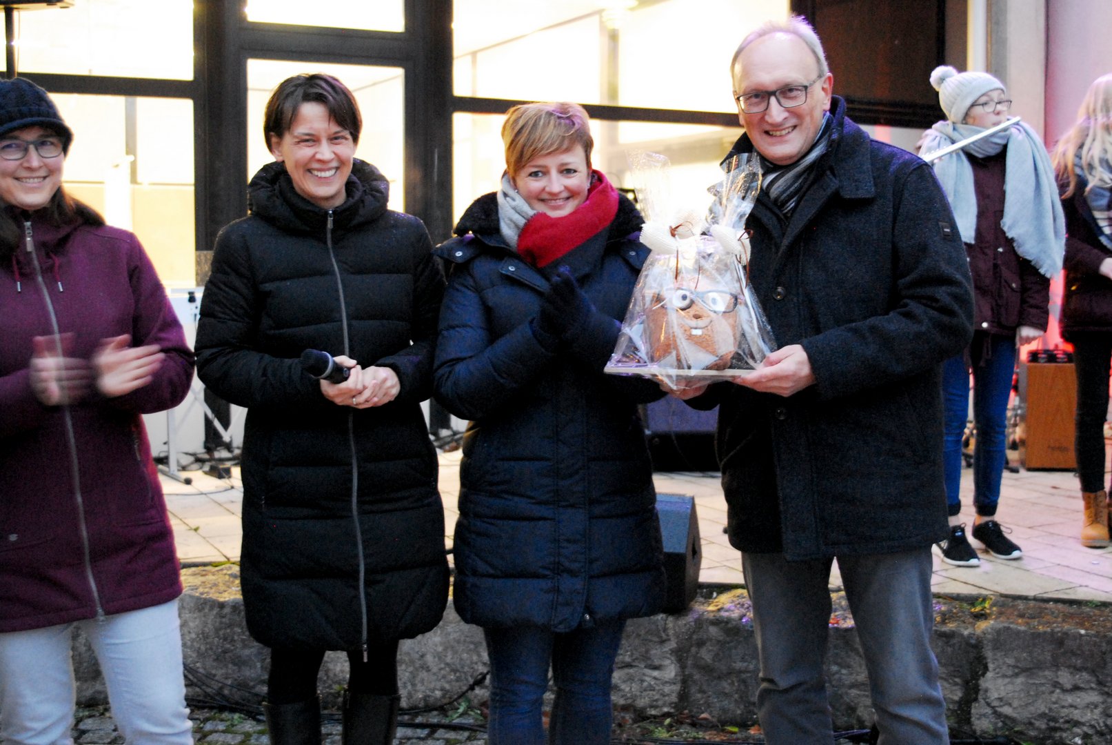 Direkt nach der Eröffnung des Weihnachtsmarktes durch eine Begrüßungsrede von Realschuldirektor Gerhard Härpfer konnte eine weitere Errungenschaft der Zusammenarbeit zwischen der Staatlichen Realschule Rain und der Stiftung St. Johannes vorgestellt werden: Das Schul-Maskottchen „Rainer, der Biber“ gibt es künftig auch als Plüschtier zum Kuscheln. Ein erstes Exemplar, hergestellt in den Werkstätten der Stiftung, hatte Frau Paus (stv. Geschäftsführerin der Stiftung St. Johannes) bereits dabei und konnte es Direktor Härpfer überreichen. Sie räumte ein, dass der Stofftier-Rainer eine wahre Herausforderung für die Mitarbeiter der Werkstätten dargestellt hatte - bisher hatte es ihn lediglich als Schlüsselanhänger oder auf Handyhüllen aufgedruckt gegeben.