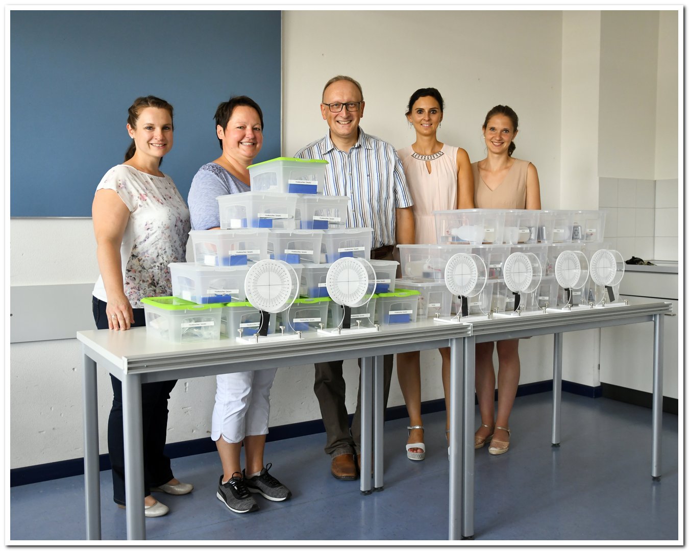 Die Physikfachschaft freut sich mit dem Schulleiter über die neuen Übungsmaterialien.