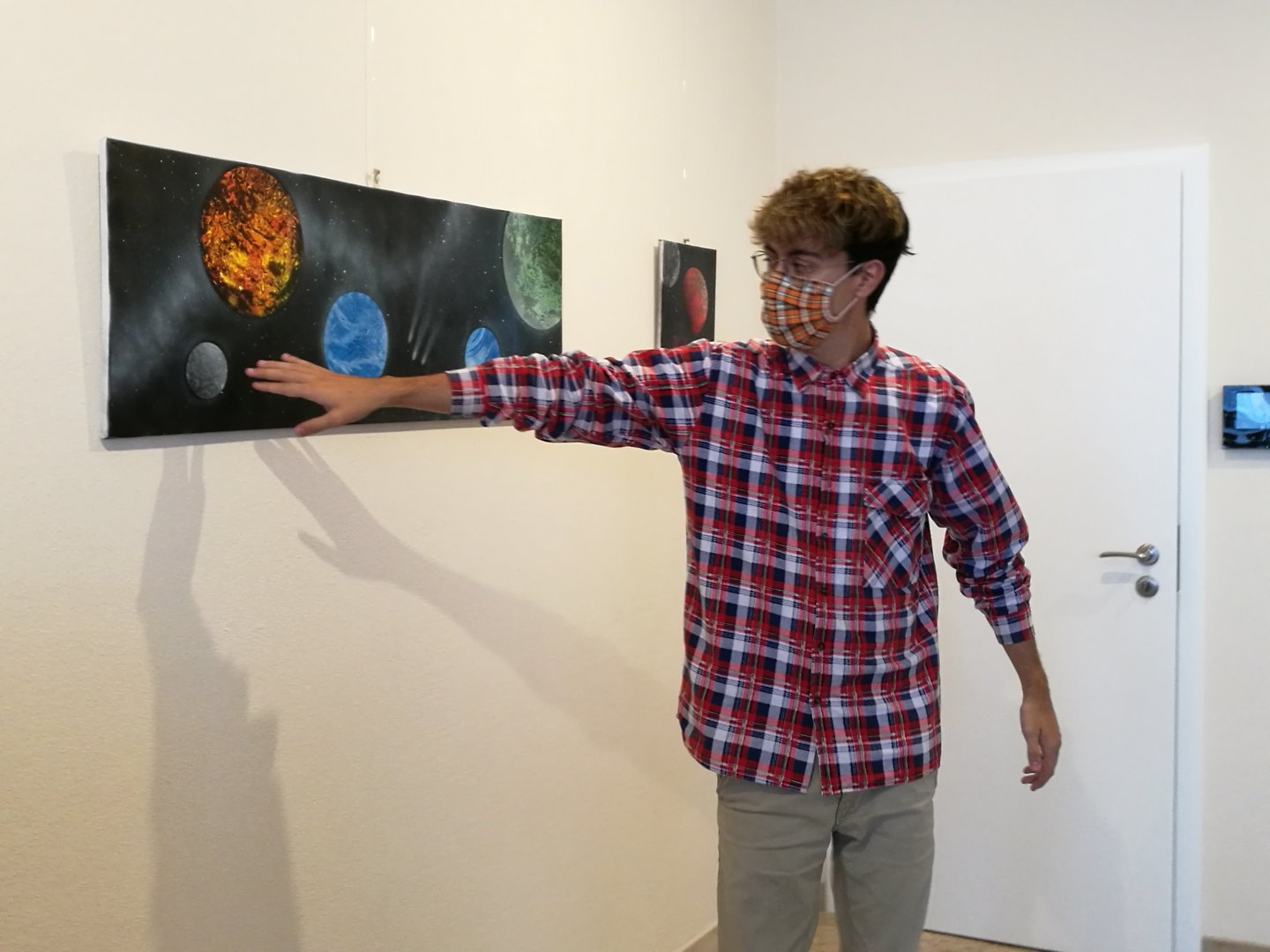 Frau Feichtinger nahm dies zum Anlass, mit ihrer Klasse 10f die Ausstellung zu besuchen. Sie wurden dabei von einem weiteren Künstler, Florian Seiler, begleitet, der an der Realschule drei Wochen lang ein Praktikum absolviert. Er hat sich auf Weltraummotive spezialisiert, die er in wenigen Minuten mit Sprühdosen auf die Leinwand sprayt. Natürlich interessierte die Schüler, was Maxi und Florian inspiriert hat, warum sie Kunst als ihr Hobby entdeckt haben, was sie beruflich verfolgen und was ihre Werke kosten.