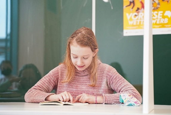 Unter Einhaltung der Abstands- und Hygienevorschriften traten die vier Klassensiegerinnen Annika Lay (6A), Svenja Hartmann (6B), Anna Genath (6C) und Lara Karg (6D) beim schulinternen Wettbewerb gegeneinander an, um die Schulsiegerin zu ermitteln. Ohne Publikum und abgeschirmt hinter einer Plexiglasscheibe durfte die jeweilige Leserin der dreiköpfigen Jury (Elternbeiratsvorsitzender Jochen Andreae und die Deutschlehrerinnen Nicole Mayr und Brigitte Angermayr) ihr Können ohne Maske präsentieren.