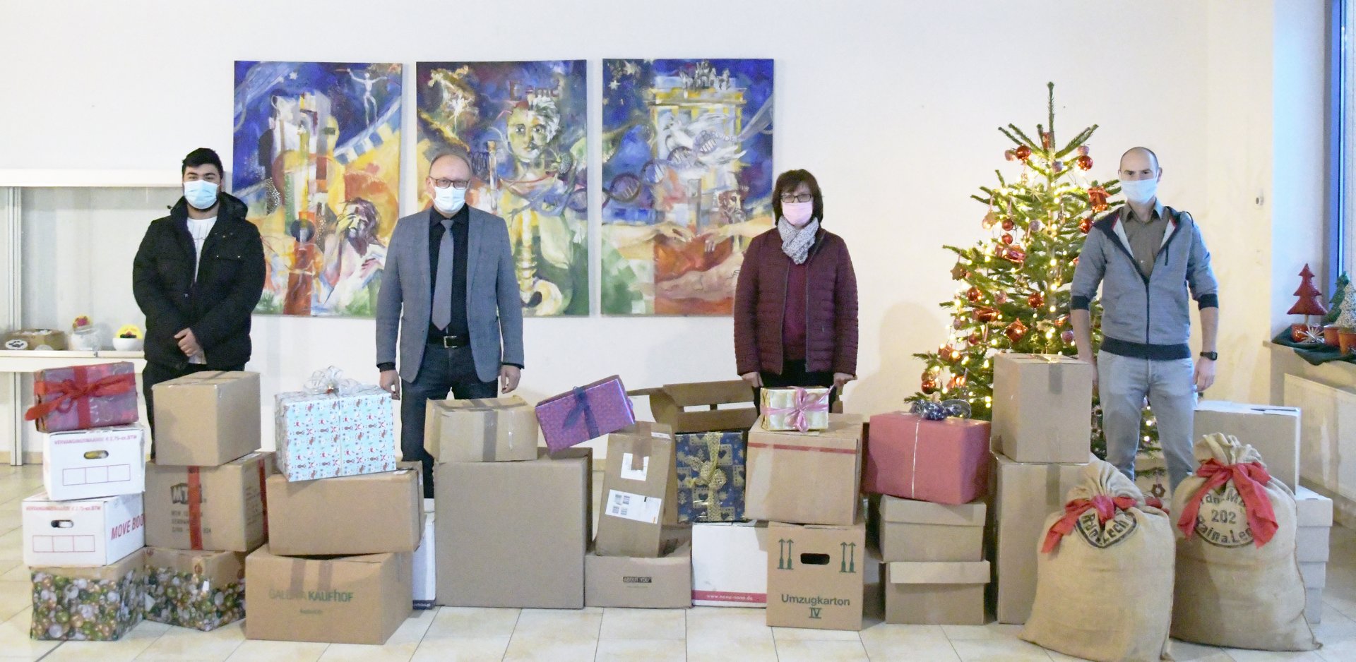 Dass jene Lebensmittel dieses Jahr aufgrund der Pandemie-Situation noch dringender gebraucht werden als in den vergangenen, machte Philomena Schlamp (zweite von rechts) von der Tafel Neuburg bei der Übergabe der Päckchen gegenüber Schülersprecher Edis Yilmaz, Realschuldirektor Gerhard Härpfer und Verbindungslehrer Stephan Geist (v.l.n.r.) deutlich. Ihr aufrichtiger Dank im Namen aller ihrer Kunden gelte daher der gesamten Schulfamilie der Realschule Rain.