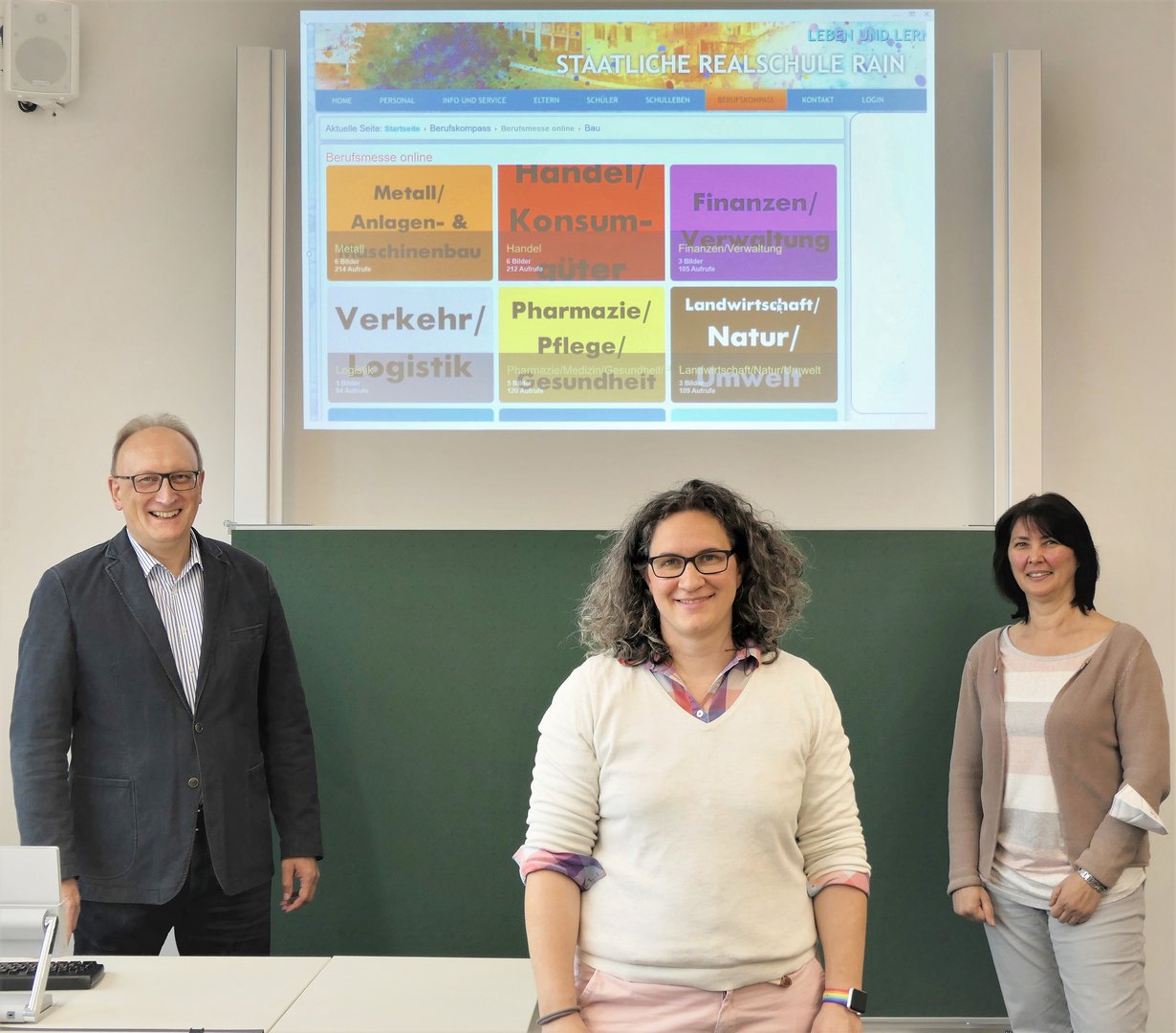Bildbeschreibung: Realschuldirektor Gerhard Härpfer, Martina Gutzmann und Mittelschulrektorin Christina Ost (v.l.n.r.) vor dem Startbildschirm des digitalen Berufskompass in der Realschule Rain.