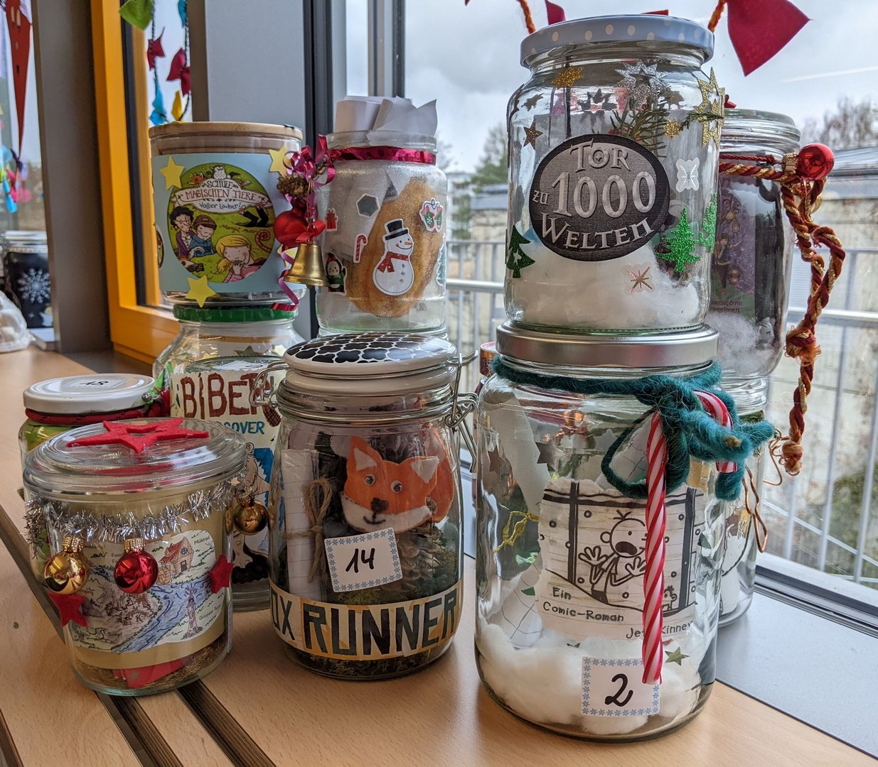 Einen besonderen Adventskalender gestaltete die Klasse 5c im Rahmen des Deutschunterrichts. In Weck-, Honig- oder Gurkengläser verpackt versteckt sich an jedem Tag ein anderes Kinderbuch unter dem Deckelchen, das jeweils von einem Schüler oder einer Schülerin vorgestellt wird.