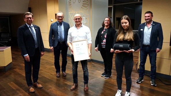 Als Preis erhielten wir im Landratsamt Donau–Ries eine Urkunde und eine Bluetooth Box für unseren Sportunterricht von Landrat Stefan Rößle und Veranstalter Alexander Wolfinger überreicht.