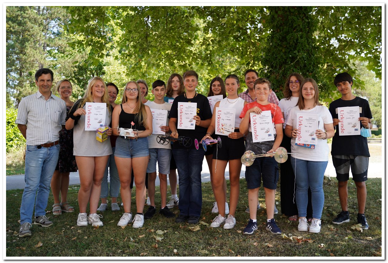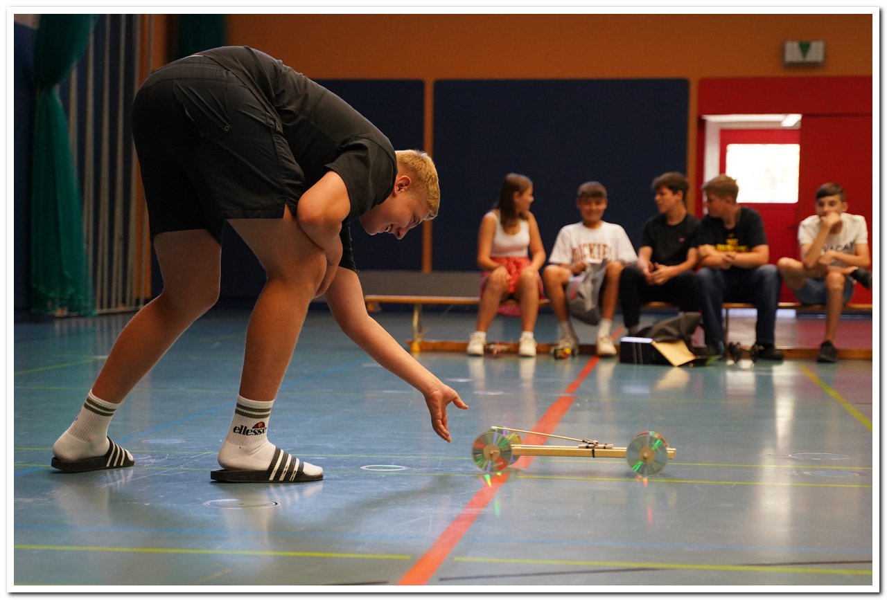 Nach einer längeren Durststrecke aufgrund der Corona-Pandemie konnte gegen Ende des Schuljahres 2021/22 an der Realschule Rain endlich wieder das berüchtigte Mausefallenrennen stattfinden, bei dem alle jungen Tüftlerinnen und Tüftler begeistert mitfieberten. Unter der Leitung der Physiklehrkräfte Frau Harbich, Frau Eckmeier, Frau Ott und Herrn Wahl bewiesen 18 Teams, bestehend aus Schülerinnen und Schülern der Jahrgangsstufen 8 und 9, dass man mit der Energie einer gespannten Mausefallen-Feder nicht nur Mäuse fangen, sondern auch selbstgebaute Autos in Bewegung setzen kann. Die Teilnehmergruppen erhielten bereits vor Wochen den Auftrag, ein Fahrzeug zu kreieren, das nur mit einer Mausefalle angetrieben wird und eine möglichst weite Strecke zurücklegen soll. Nicolas Heckel, Patrick Zinsinger und Jonathan Geier aus der Klasse 8A kamen der Aufgabenstellung am besten nach. Ihr Gefährt legte mit 23,60 Meter die größte Distanz zurück. Platz zwei belegten die Schülerinnen Lucy Lichtenstern, Marie Sauer und Lena Seibert mit einer Weite von 14,00 Meter. Der dritte Platz ging an Erdogan Kocak aus der Klasse 8E, dessen Mausefallenauto eine Weite von 12,80 Meter erreichte. Dass Technik auch schön sein kann, bewiesen Benjamin Biber und Lukas Ruthemeier, deren Auto nicht nur aufwändig in einem 3D-Drucker entwickelt wurde, sondern auch ästhetisch überzeugte. Um die erbrachten Leistungen zu würdigen, wurden die Schülerinnen und Schüler mit Urkunden und Sachpreisen bedacht. Fachschaftsleiter André Wahl dankte abschließend dem Elternbeirat der Realschule Rain für die gesponserten Mausefallen sowie der „Eismosena“ für die Eisgutscheine, die die Gewinner erhielten.