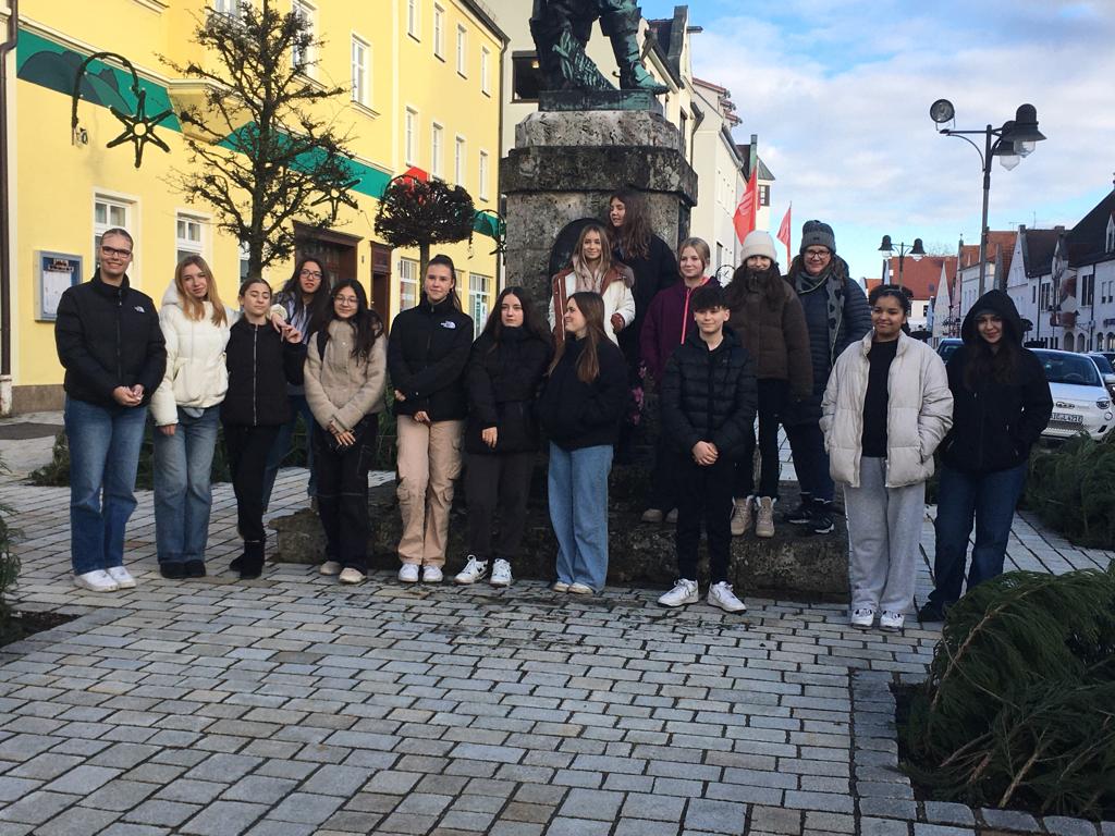 Die Schülerinnen und Schüler haben zusammen mit Betreuerinnen und Tutor/-innen Mitte Dezember ihre Schulstadt Rain und deren historische Besonderheiten erfahren und kennenlernen dürfen. Die Stadtführerin, Frau Huith, hat sich für die drei Termine eine besondere Runde durch den historischen Stadtkern von Rain ausgesucht, die auf die Jugendlichen passend zugeschnitten war. Gestartet wurde am Schwabtor und weiter ging es dann entlang der Stadtmauer mit Halt an verschiedenen Rainer Sehenswürdigkeiten. Bei einer kurzen Rast im Schlossgarten freuten sich alle über warmen Kinderpunsch und Spekulatius.