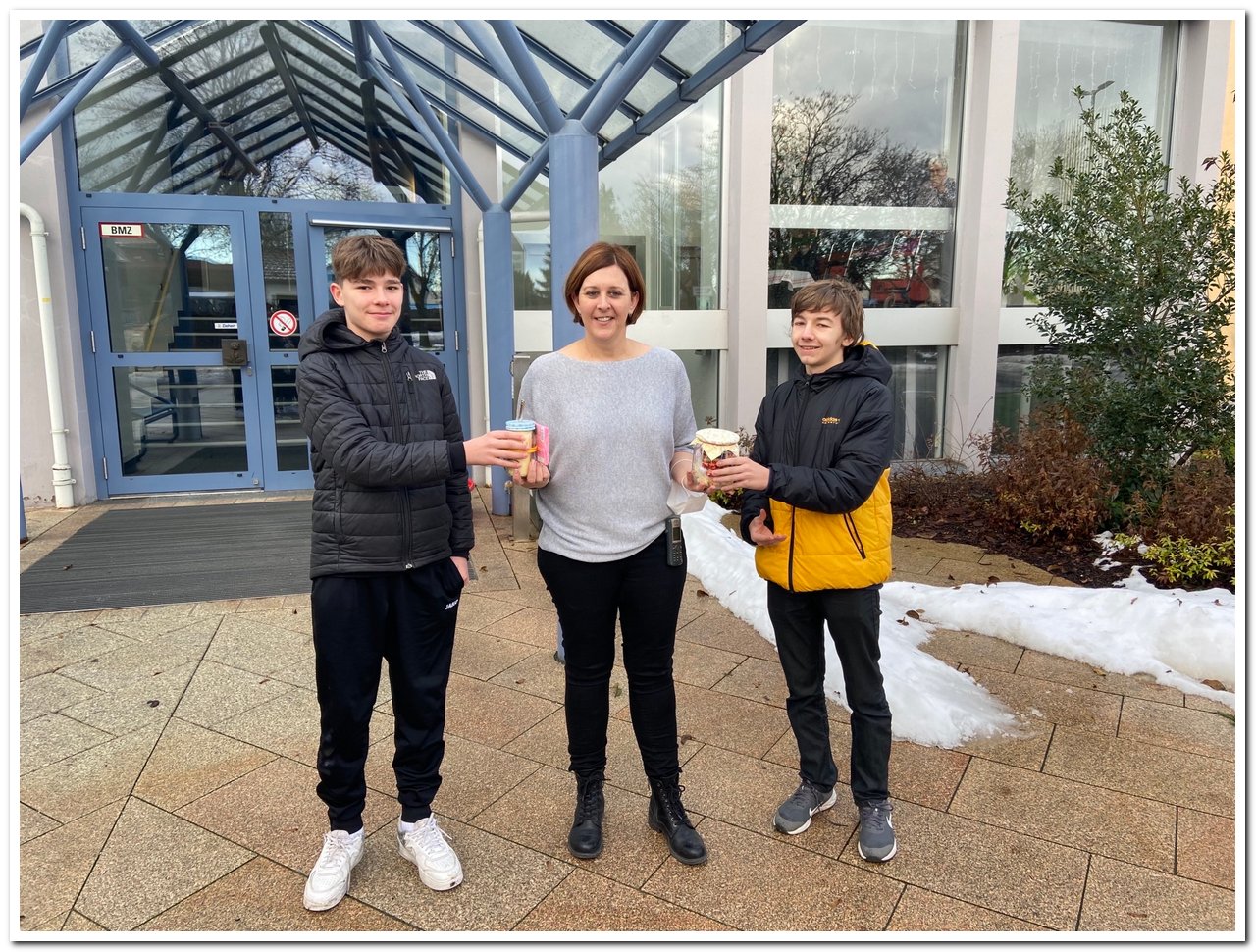 Diese Meinung teilte auch Karl-Heinz Feichtinger, der ebenfalls anwesend war und zugunsten dessen Stiftung die Spenden gingen, welche statt Eintritt von den Besuchern erbeten wurden. Zusammen mit dem Erlös aus Verkauf von Glühwein und Punsch, den die SMV organisiert hatte, konnten so 800,- Euro an Manuela Feichtinger – Ehefrau des Stiftungsgründers und Lehrerin an der Realschule – übergeben werden. Mit dieser Spende reiht sich das Konzert in das Jahresmotto der Schule ein, welches im laufenden Schuljahr lautet: „Solidarität – wir halten zusammen“. Musiklehrerin Maria Keller, die unter anderem den Chor „Vocals und More“ leitete bringt es dabei auf den Punkt: „Wenn ein einzelner etwas Gutes tut, ist das eine große Sache. Wenn wir aber alle zusammenlegen, kann etwas richtig Großes dabei herauskommen.“>