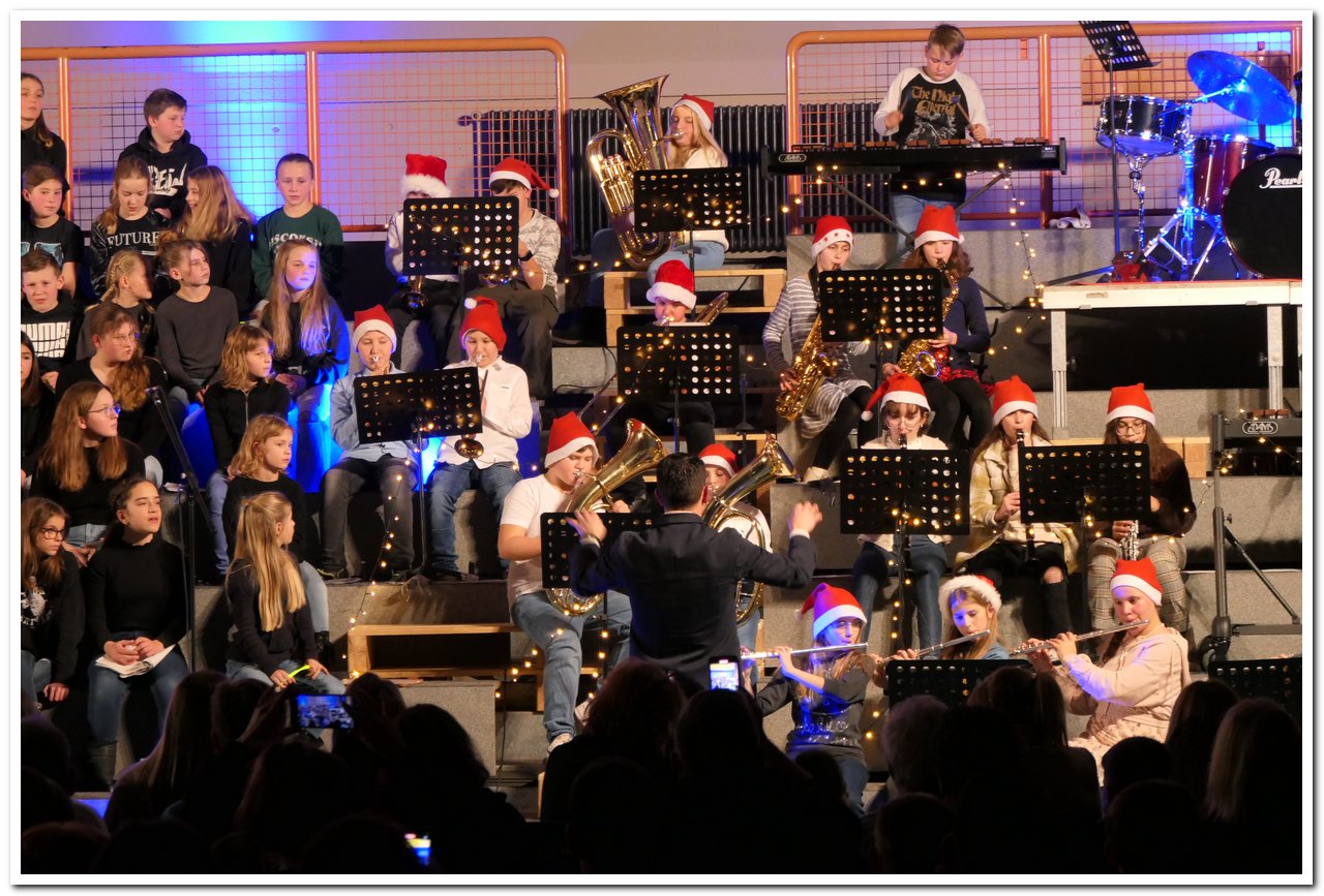 Nach gerade einmal drei Monaten Unterricht trat wenig später an diesem Abend auch das neu gegründete Projekt „Bläserklasse“ zum ersten Mal auf. Die 5.-Klässler zeigten den verblüfften Zuhörern, was in so kurzer Zeit möglich ist und boten versiert bekannte Weihnachtslieder dar.