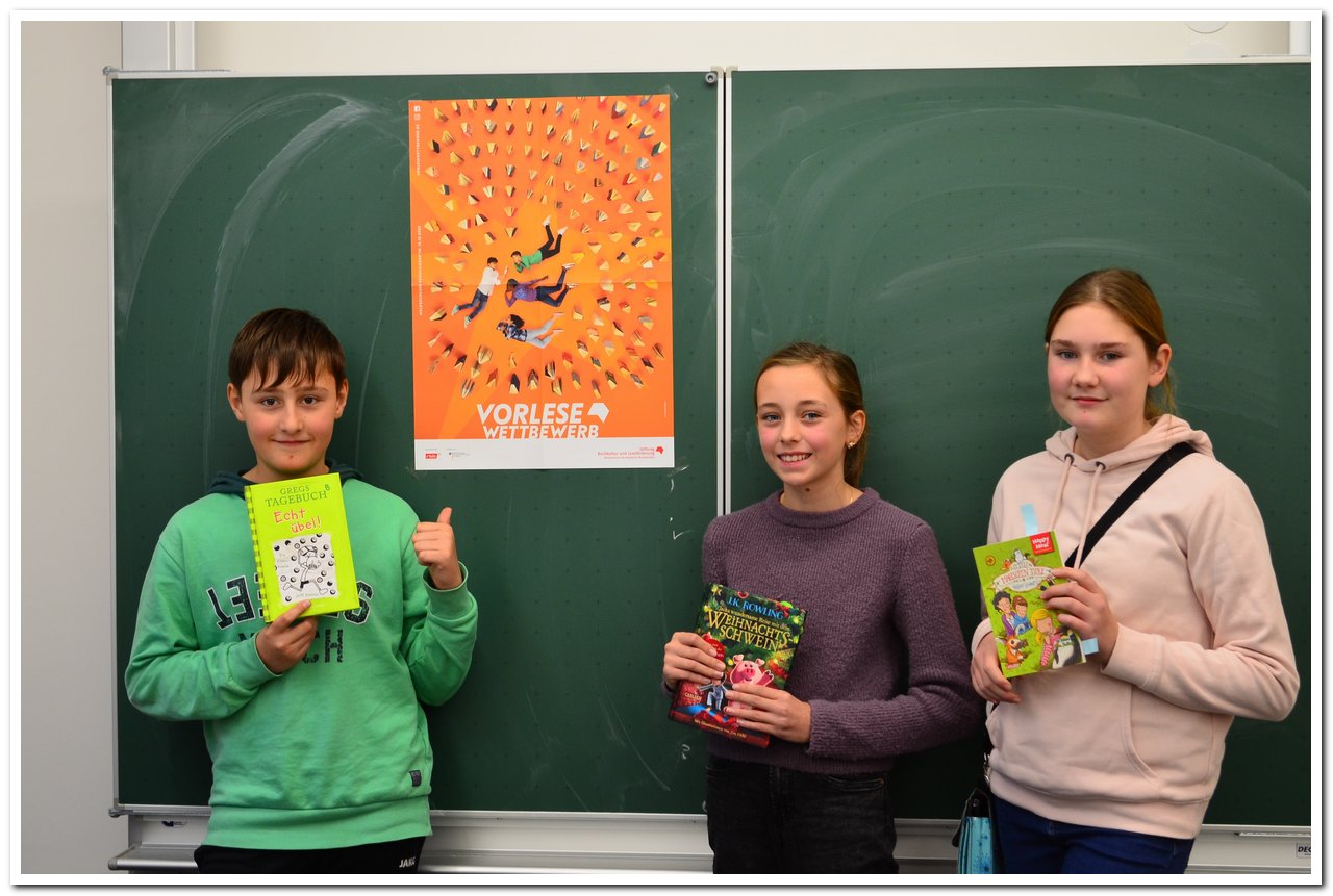 Zwei Mädchen und ein Junge traten beim diesjährigen Wettbewerb der Sechstklässler gegeneinander an. Zunächst ging es darum, einen selbstgewählten und eingeübten Text möglichst überzeugend vorzutragen. Leandra Grabisch (6b) las dabei eine Stelle aus Margit Auers „Schule der magischen Tiere“, Anna Burzler (6c) hatte sich J.K. Rowlings „Jacks wundersame Reise mit dem Weihnachtsschwein“ und Nicklas Olbertz (6a) „Gregs Tagebuch“ ausgesucht. In der zweiten Runde ging es für die drei Leser darum, einen für sie unbekannten Text – in diesem Jahr „Der Drachentöter“ von Christiane Gohl - möglichst fehlerfrei und lebendig zu interpretieren.