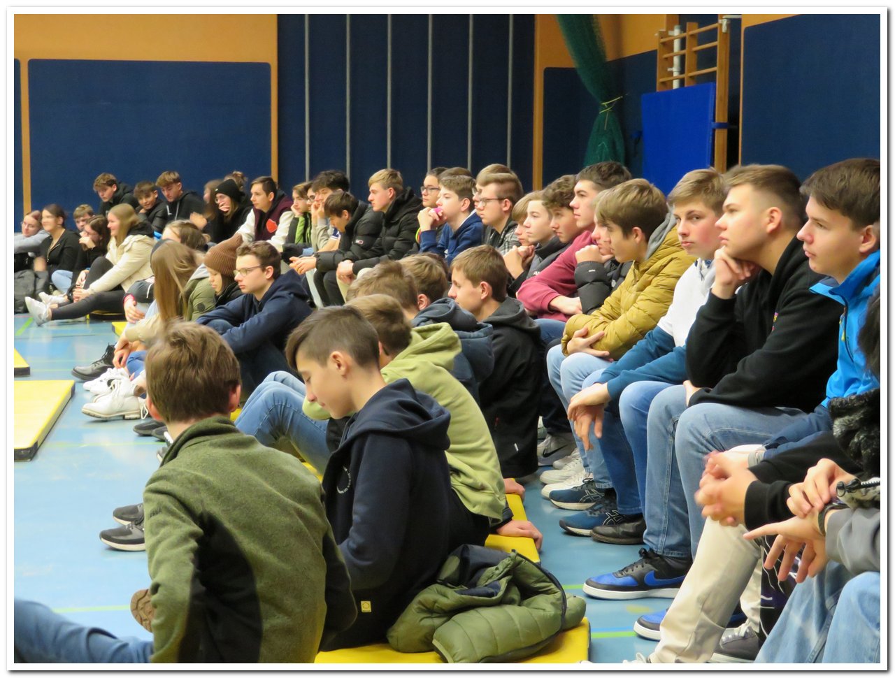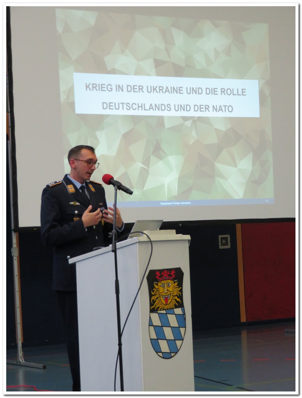 Im zweiten Teil erklärte der Jugendoffizier anschaulich die geschichtlichen Hintergründe des Ukrainekriegs: neben dem Kalten Krieg und der Gründung zweier konträrer Militärbündnisse (NATO – Warschauer Pakt), erläuterte der Referent auch, wie der Zerfall der Sowjetunion 1991 und die Unabhängigkeit der Ukraine das Machtverhältnis im Osten nachhaltig verändert hätte. In einem kurzen Abriss wurden die Bestrebungen der Ukraine zu einer Aufnahme in die EU und der NATO behandelt sowie auf die Annexion der Krim 2014 und dem danach folgenden Bürgerkrieg im Donbass eingegangen. Auch die Truppenverstärkung an der Ostflanke und die sich daraus nach russischer Sichtweise ergebende Bedrohungslage wurden mit Florian Herrmann kontrovers diskutiert. Als abschließenden Gedanken ging der Referent auf den schwierigen Balanceakt der Bundeswehr und der NATO in diesem Konflikt ein.