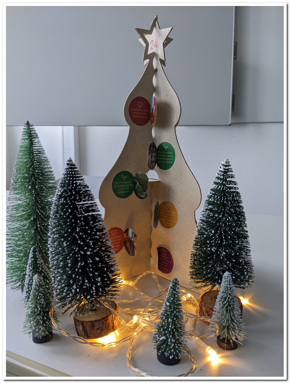 Konkrete Beispiele für gute Taten, die sich hinter den Türchen versteckt haben, sind etwa “2 Jahre sauberes Wasser für eine Textilarbeiterin in Bangladesch”, “1 Min. Berufsvorbereitung für Menschen mit Behinderung in Deutschland” oder “150 m2 Amazonas-Regenwald werden in Brasilien geschützt”.
